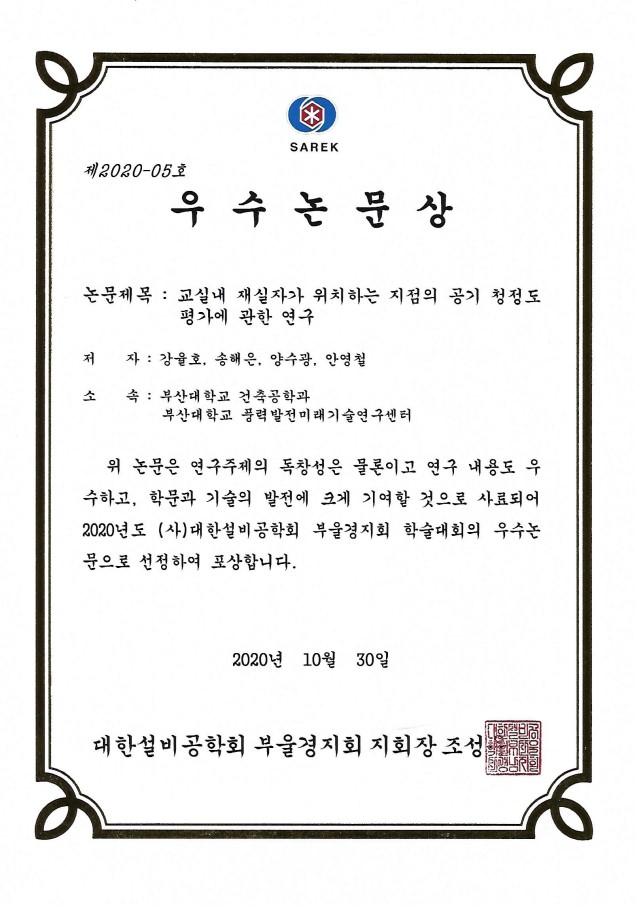우수논문상 - [2020년도 대한설비공학회 부울경지회 학술대회]